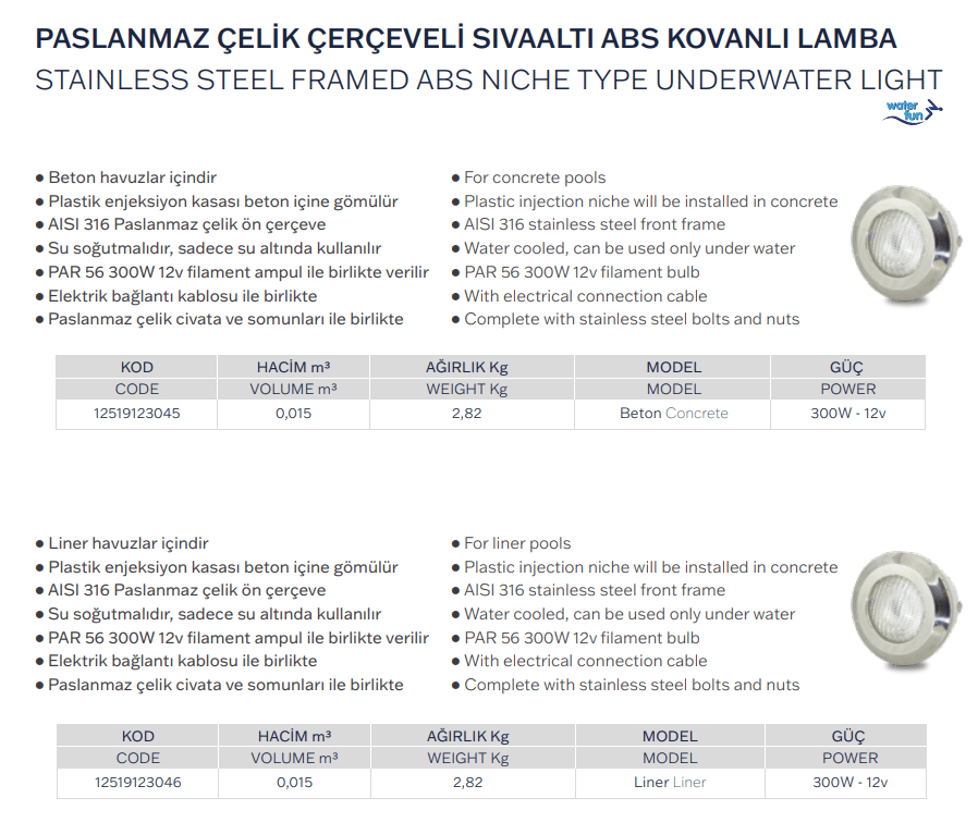 Havuz Lambası Gömme Tip Liner 300W Paslanmaz Çerçeveli